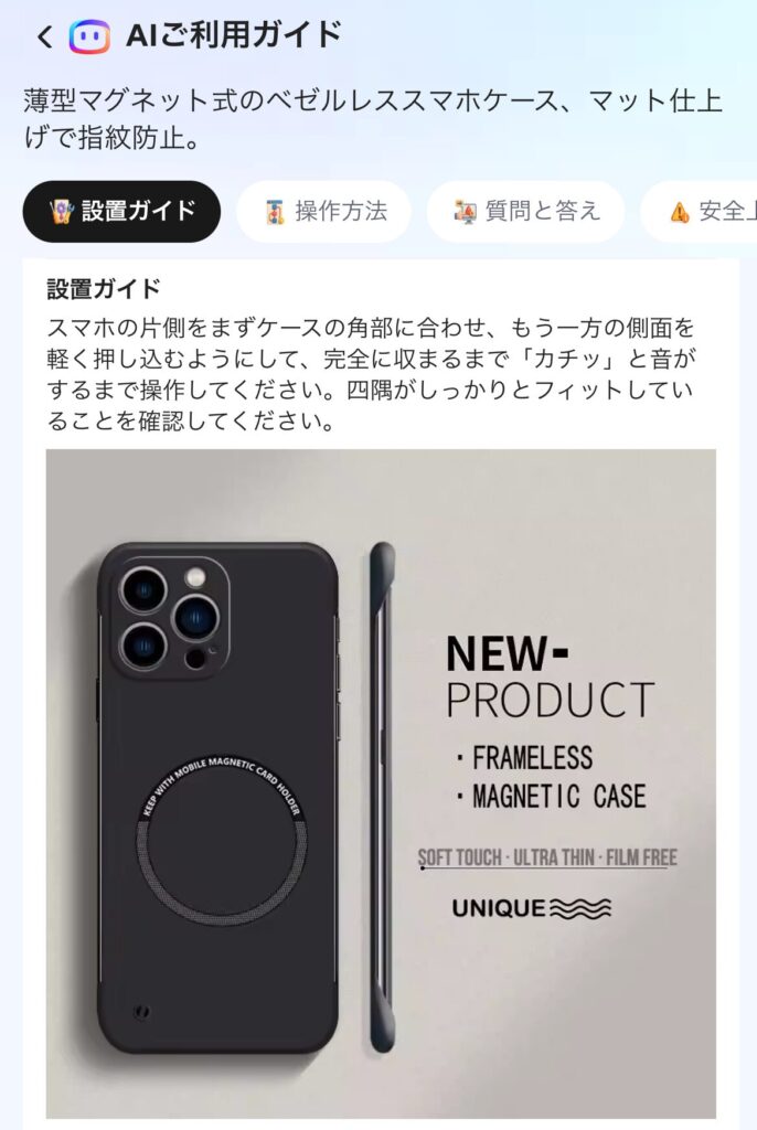 こういったケースで購入した商品に対し、詳細な説明があるのなら、ユーザーにとっては非常に便利だと思いますが、そんな機能がアリエクスプレスに追加されており、それが商品の説明をAIが詳しく行ってくれる『AIご利用ガイド』です。