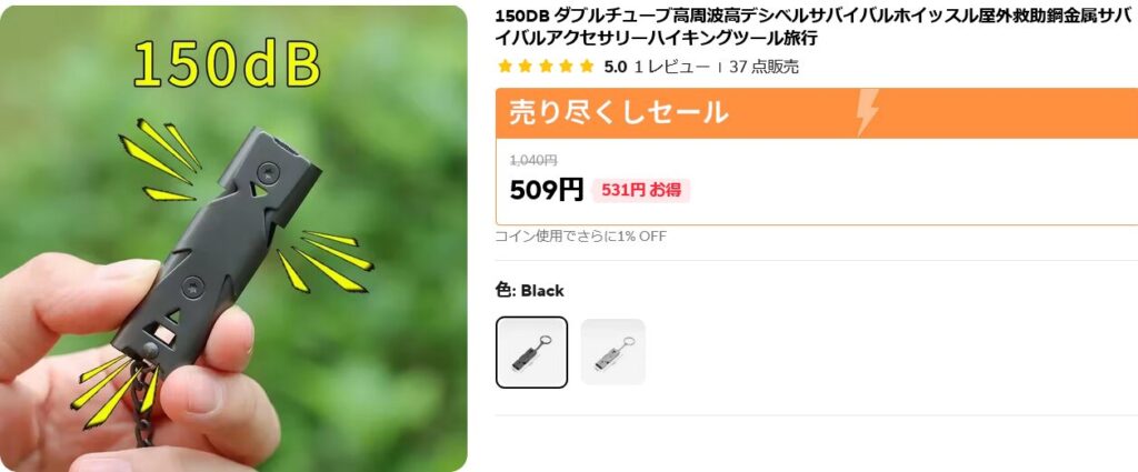 熊などの野生動物は音に敏感で、特に大きな音がする方へは近づかない習性があるそうですが、アリエクスプレスにて吹けば150dbの大音量が出るというキーホルダー型のホイッスルが500円ほどで販売されていて、これはいい商品だと思って購入しました。