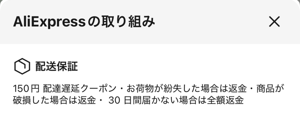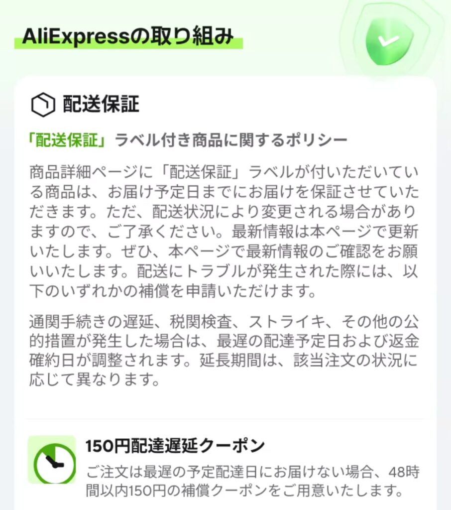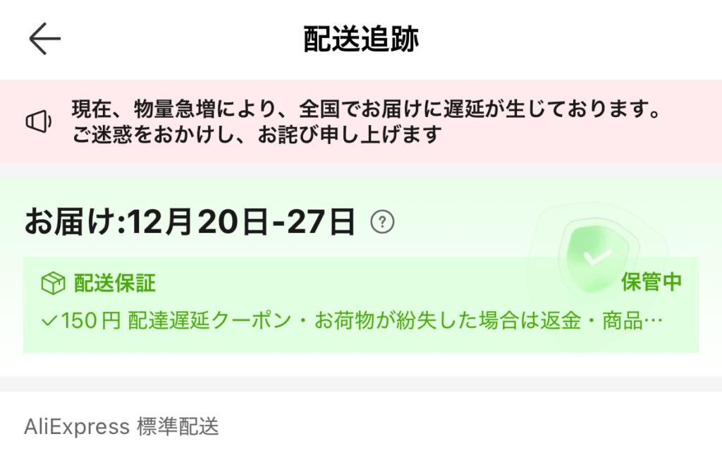 このシステムがスタートした時、アリエクスプレスが指定した配達予定日が割とめちゃくちゃで、こちらとしては不満や不安を持つほど待たされていないのにも関わらず、お詫びのクーポンが貰える機会が非常に多く、下手をすると毎回のように遅延クーポンが貰えることもございました。