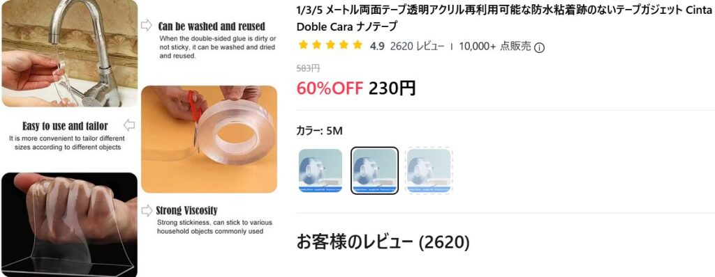 この両面テープは、日本国内の100円ショップで販売されているクロコダイルテープという両面テープに非常に似ており、貼ったものを剝がした後に水で洗うと再び使用できるタイプとなっております。