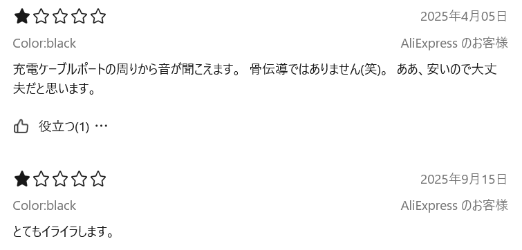 フィードバックを見ると概ね高評価が並んでいて、確かに耳を塞がないイヤホンとして使えないことはないのですが、骨伝導かというとそうではなく、一つ星にはその旨がずらっと並んでいたりします。