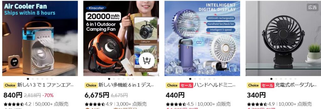 アリエクスプレスで販売されている小型扇風機はバッテリーが内蔵されている手持ち式や、机回りに邪魔にならないミニサイズが主流で、今年は世界的に暑さが厳しいからか、万単位、あるいは何十万単位で注文が入っているものも散見され、とにかくどれもこれもが良く売れている印象でした。