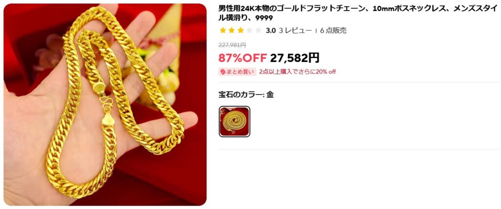 そんなことを踏まえつつ、アリエクスプレスには商品名に本物24Kと書かれたゴールドのネックレスがたったの2.7万円で販売されております。