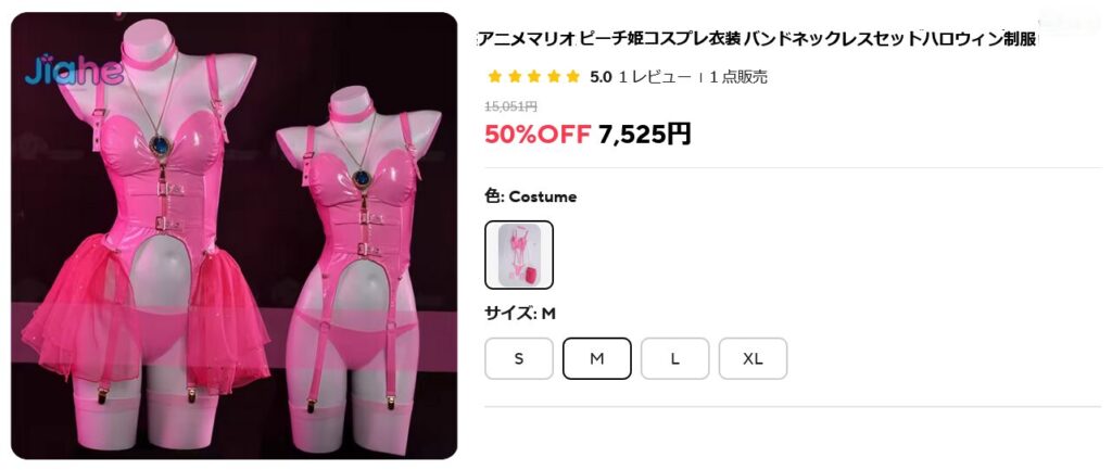 着用したらやたらとセクシーないでたちになるであろうこの商品ですが、商品ページにマリオ、ピーチ姫との文言があるので、お店側としては、これを着たらピーチ姫になれるアルとの確信を持って販売していると思われます。
