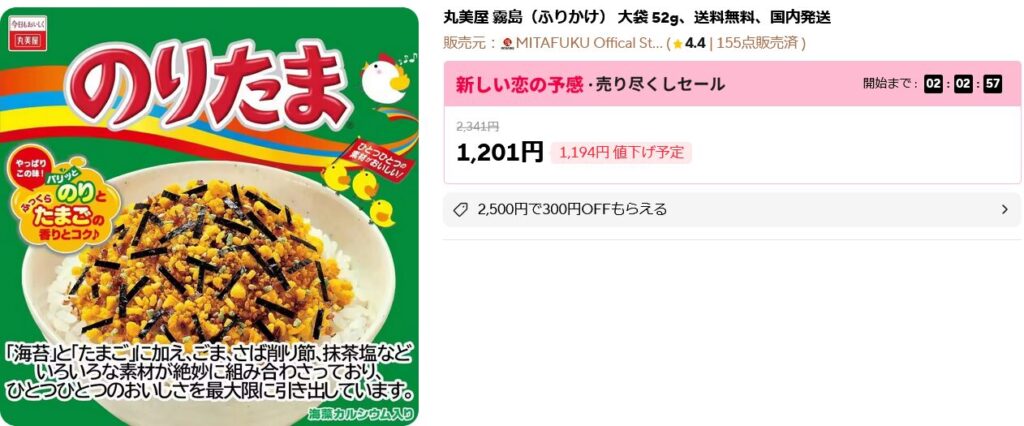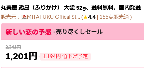 なによりも、このふりかけの上代設定が2341円になっており、セールで1194円も値下げするとアピールしていることも、その酷さをさらに増しているように思えます。