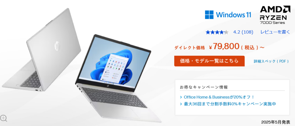 すぐに購入する前提で色々と探していると、HPの公式オンラインショップにてセールが行われており、税込79800円で15.6インチのノートパソコンが売られており、どこのECサイトを見てもこのお値段はなかったのですかさず購入しました。