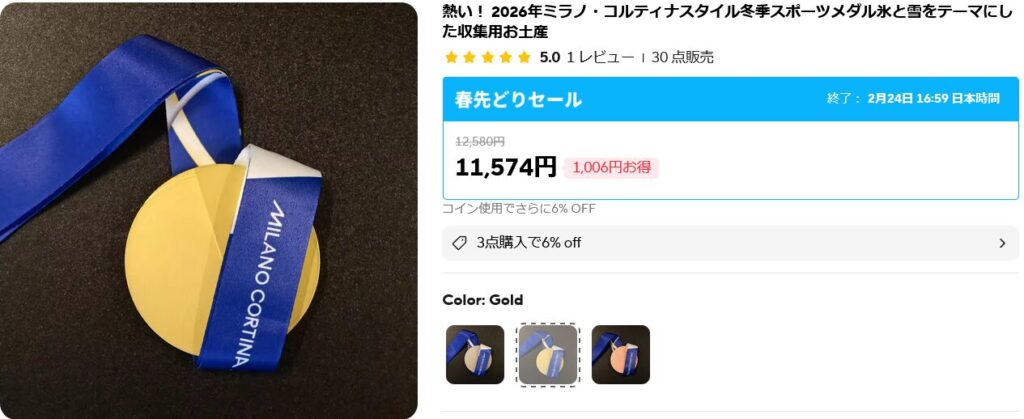 注文が特に入っているのはメダルのようでして、パチモノのくせに結構なお値段にも関わらず、そこそこ売れている痕跡が見られ、特に金メダルは完売してしまっているようです。