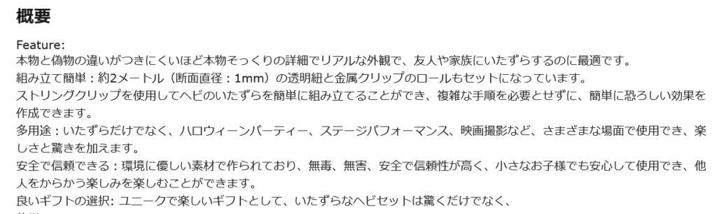 こちらの商品も日本人ユーザーが購入した痕跡は一切見られないものの、日本人以外にはえらく売れている商品で、ゴムヘビはかなり好評を博している商品だったりします。