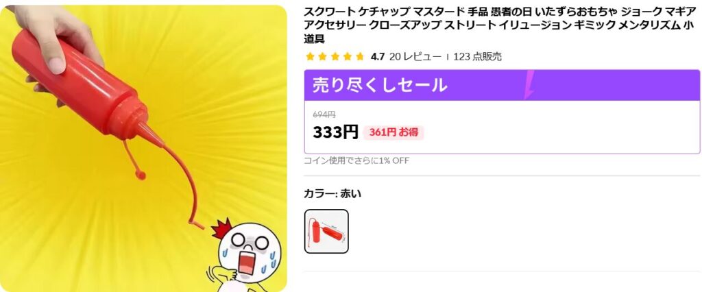 例えば、人に向けて噴射させて驚かせるいたずら用ケチャップのボトルは、80年代、いや、私だって記憶がかなり曖昧な70年代に流行っていた商品だと思うのですが、こんな商品がアリエクスプレスでは今でも売られております。