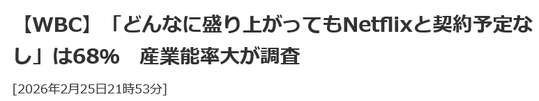ちょうどそんなことが起きた時、ネットフリックスに契約してWBCを視聴するか?との調査の結果が報じられており、どんなにWBCが盛り上がったとて、1万人の中の68%の人間がネットフリックスは利用しないとの結果が出ておりました。