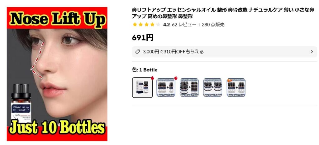 その良からぬ商売の中で新製品が販売されたらしく、今度は塗るだけで鼻がどんどん高くなるという商品を見つけました。