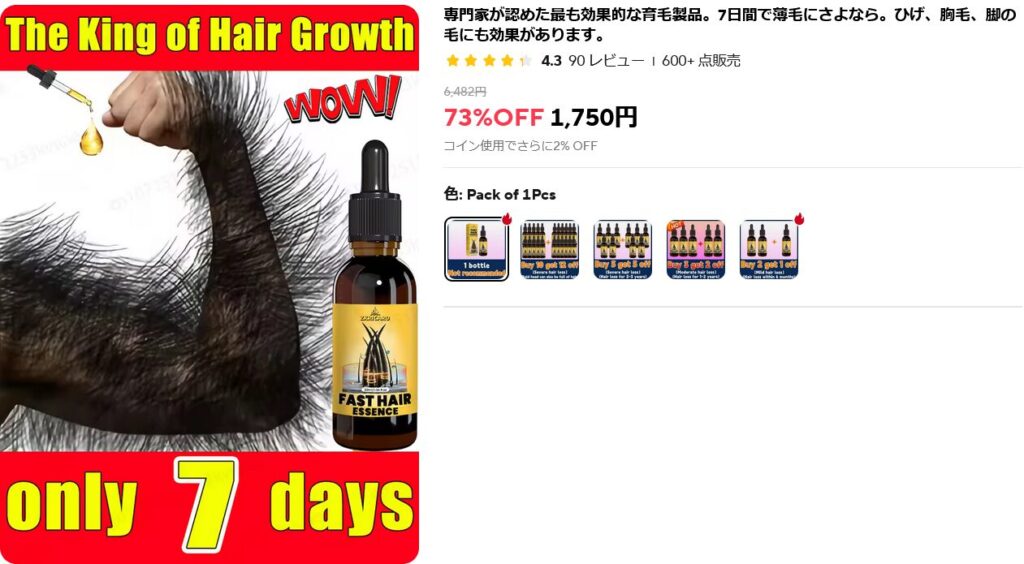 例えば、たったの7日間振りかけるだけでありとあらゆる個所からぼうぼうに発毛してしまう薬品が2千円もせずに販売されていたりします。