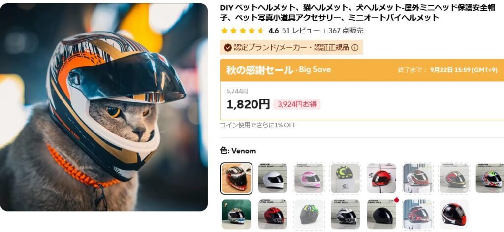 しかし、上のネコ用ヘルメットに関しては、コスプレなのか、それとも実用なのかもよく分かりませんし、そもそも、ネコという性質上、バイクに大人しく乗ってくれるのかもよく分かりませんから、これは売れないだろうと思いきや、400件近い注文が入っている人気商品だったりします。