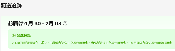 それが1月の下旬になった途端、配送予定が最短で2日、長くても6日間で届くとの予測が普通に出てくるようになりまして、上の画像は1月28日に購入してその日の内に発送されたエスポ便ですが、最短で1月30日、最長でも2月3日で届くとのこと。