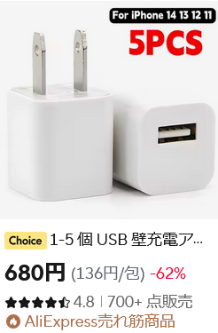 突然、この充電器5個で680円、つまり1個当たり136円で販売されることもあって、どのお値段が正しいのかよく分からないほどの変動幅があります。