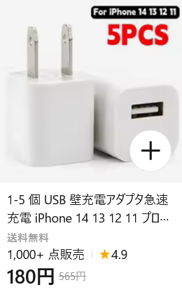 例えば、上の画像の充電器は、よりどりを見ていると割としょっちゅう目にするタイプで、5pcsと記載されているも、実際には1個売りなのですが、通常価格は300円前後で販売されており、よりどりでは180円が最安値だと思います。