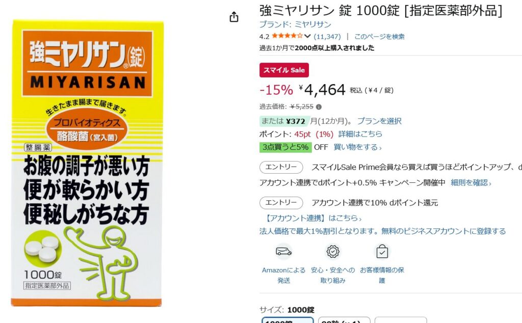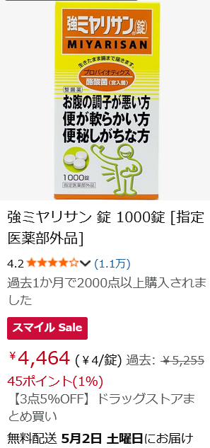この強ミヤリサン錠は整腸剤の中でもなかなか高価な部類でして、アマゾンでも通常は5680円で販売されています。それが現在行われているアマゾンセールでも4464円で販売されていて、このお値段は破格だと個人的には思います。