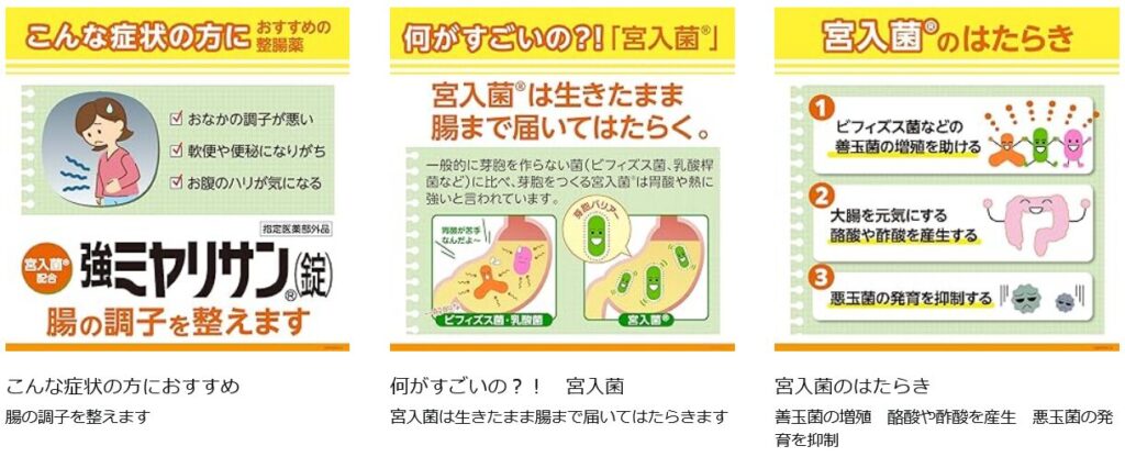 もちろん、この手の商品は個人差が大きいですし、私が以前飲んでいた整腸剤が悪いとも思えません。しかし、強ミヤリサンを服用する前と比べると、明らかに違う腸の変化を自分自身は感じております。