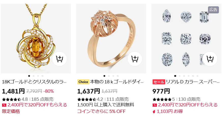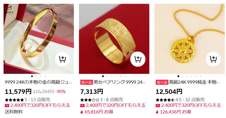また、本物と表記されている商品が酷いことが分かるのが、アリエクスプレスの検索窓で『本物』というキーワードで検索した時でして、そこにはゴールドやプラチナ、宝石などが山のように出現します。