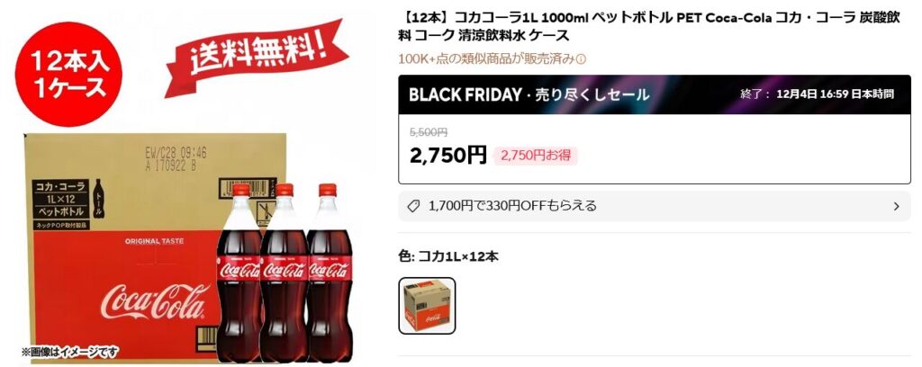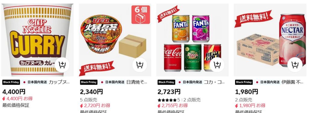 また、お米以外にもコカ・コーラやカップヌードル、日清焼きそばUFOなども販売されておりますが、これらすべてが転売品だと思われます。