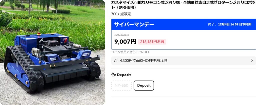 また、色の欄をよくよく見るとDeposit、つまり前金や手付金との表記がございますので、9000円でこの草刈り機が買えるわけではないのですが、注文を入れたおよそ700人超えのユーザーは9千円で買えると思って注文を入れているはずで、前金として9千円を支払ったユーザーはほぼほぼゼロなはずです。