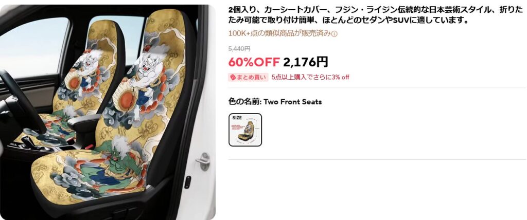 そこで思いついた商品が上の画像の風神雷神のシートカバーでして、これならば、車の外側ではなく、車内なのでオールセーフです。