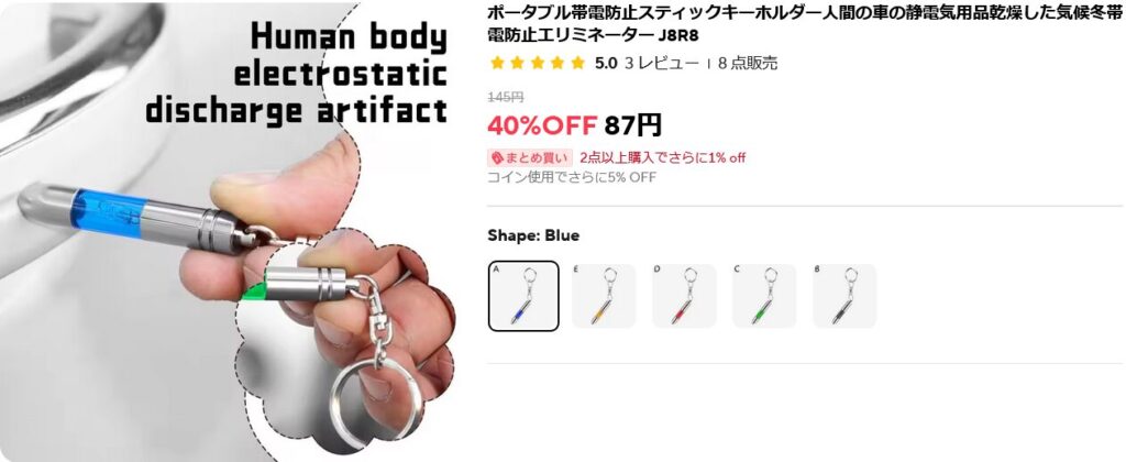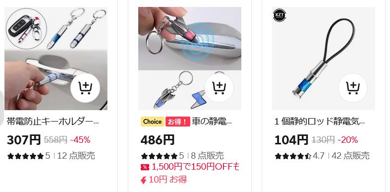 そこで、アリエクスプレスのカー用品には、静電気除去キーホルダーという商品が色々と販売されているので買ってみると、ある共通点が見られました。