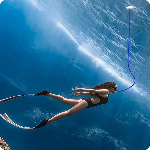 普通のシュノーケルでは息継ぎのために浮上する必要があるものの、このロングシュノーケルを使えば、3m程度の水中なら長時間にわたって潜っていることができるとのこと。