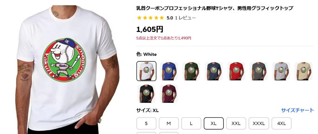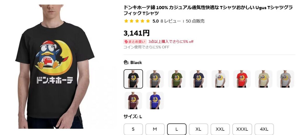 日本人には割とお馴染みの量販店のキャラクターですが、こういったTシャツで100件近い注文が入ることはないため、これは相当な売れ筋商品だったります。