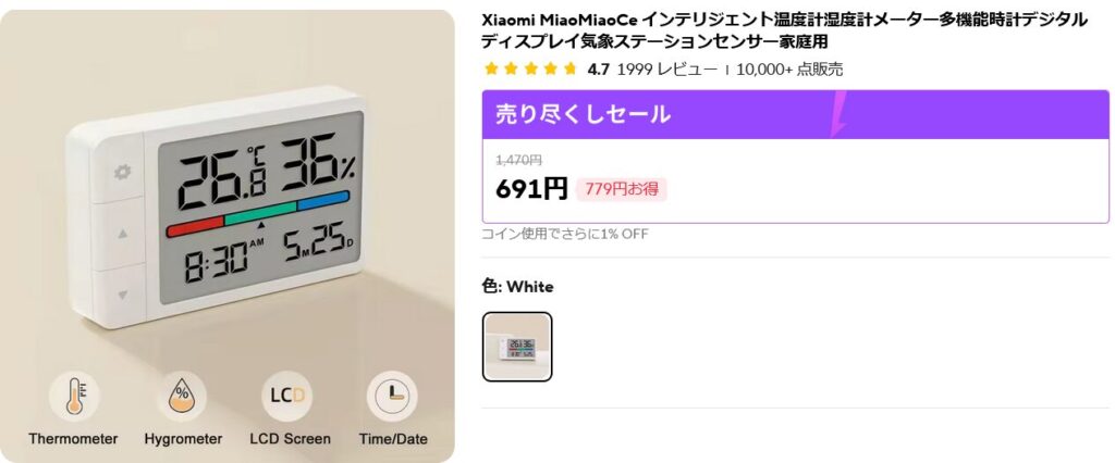私が先日のセールで購入した温湿度計にも上の画像のようにXiaomiの文字が入っておりまして、お値段はというとセール価格でたったの400円でした。