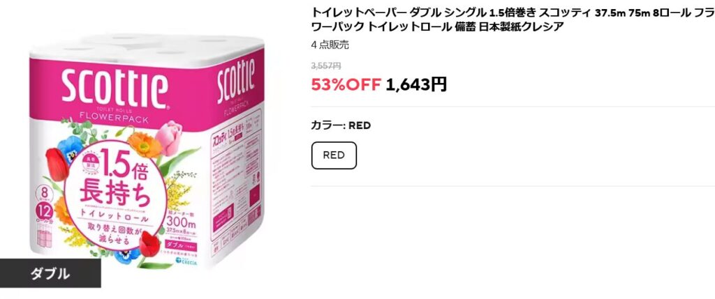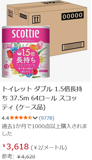 上の画像は、アリエクスプレスの日本国内発送商品として販売されていた、日本の有名メーカー製のトイレットペーパーでして、お値段は1パック送料無料1643円です。