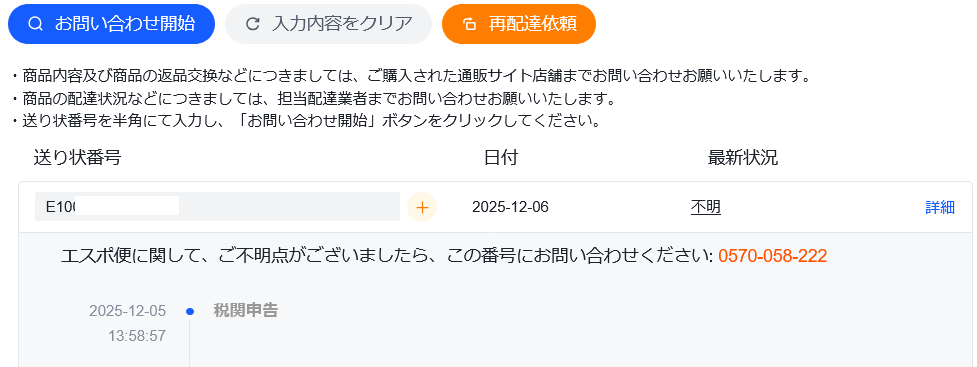 そんなエスポリアの追跡情報検索にて、最新状況が『不明』と表示されました。