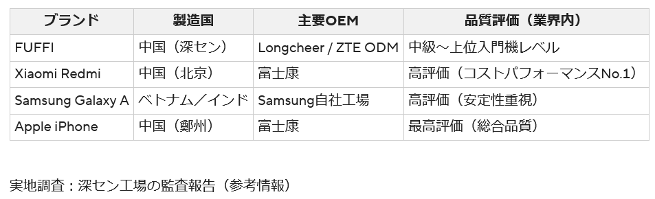 あれ、なんでこんな言い回しなのだろう?とちょっとだけ疑問が浮かびましたが、次に書かれているApple、Samsung、Xiaomiの各社が製造するスマホとの比較表を見ると、FUFFIというメーカーはこの3社と引けを取らないかのような立ち位置の説明がされておりました。